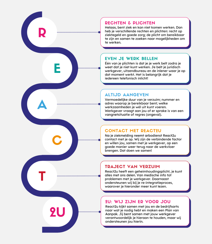 Bij React2u hoef je je om die vragen niet druk te maken. Door ons korte, duidelijke en haalbare visueel verzuimprotocol dragen wij succesvol bij aan het verminderen van je verzuim en het bevorderen van de inzetbaarheid van je medewerkers.